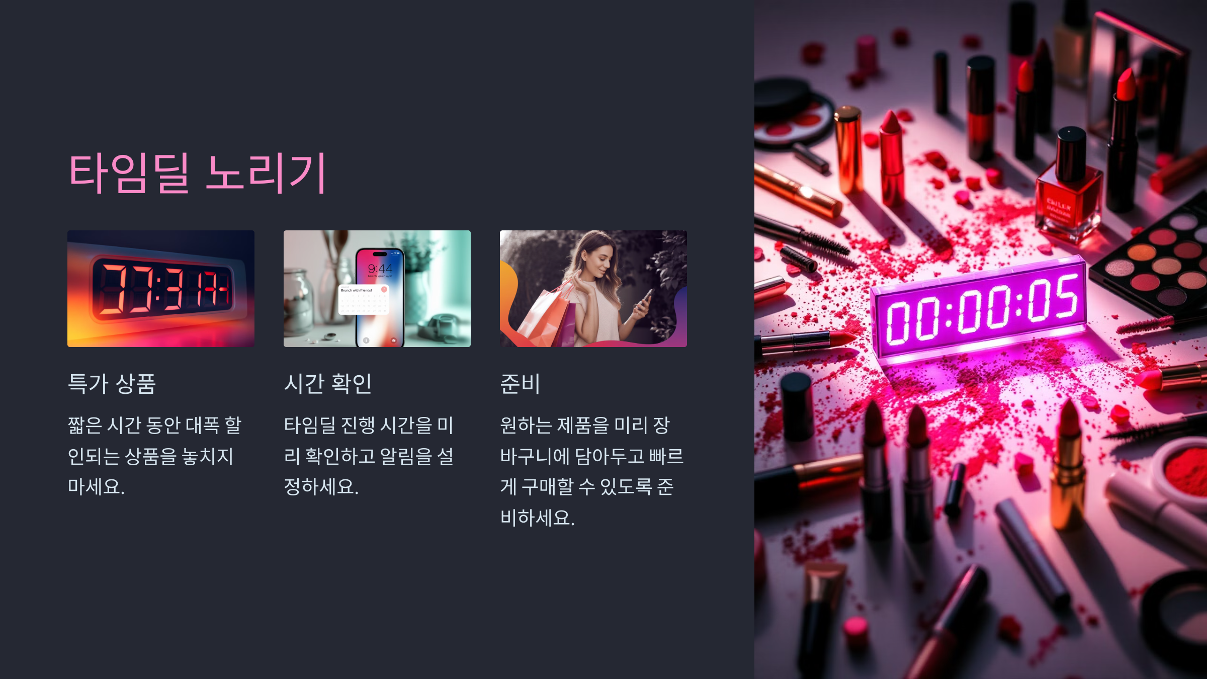 광군제에서는 타임딜 형태의 특가 상품이 자주 등장합니다. 특히 화장품은 이런 타임딜에 자주 포함되며, 짧은 시간 안에 대폭 할인된 가격으로 제공되기 때문에 기회를 잘 잡아야 합니다. 타임딜이 진행되는 시간을 미리 확인하고 준비하세요.