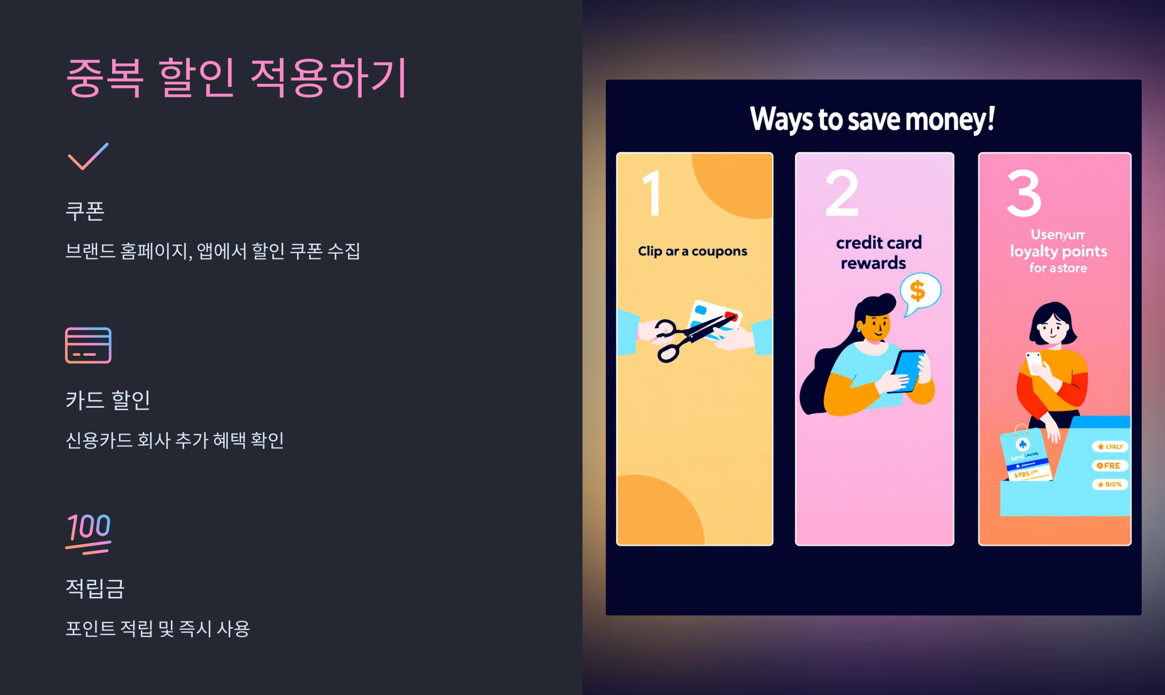 - 쿠폰: 브랜드 홈페이지나 모바일 앱에서 제공되는 할인 쿠폰 수집