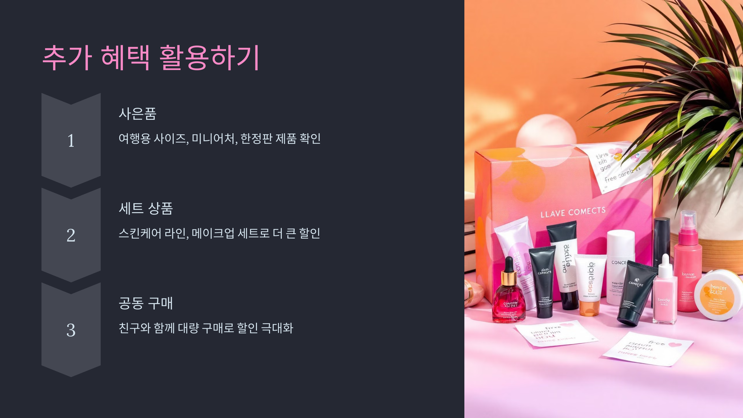 화장품 구매 시 사은품은 빠질 수 없는 혜택입니다. 브랜드마다 광군제를 맞아 특별한 사은품을 제공하는데, 여행용 사이즈, 미니어처, 한정판 제품 등을 받을 수 있습니다. 구매할 제품과 함께 제공되는 사은품을 미리 확인하고, 해당 브랜드의 공식 홈페이지나 SNS에서 사전 정보를 얻는 것이 좋습니다.