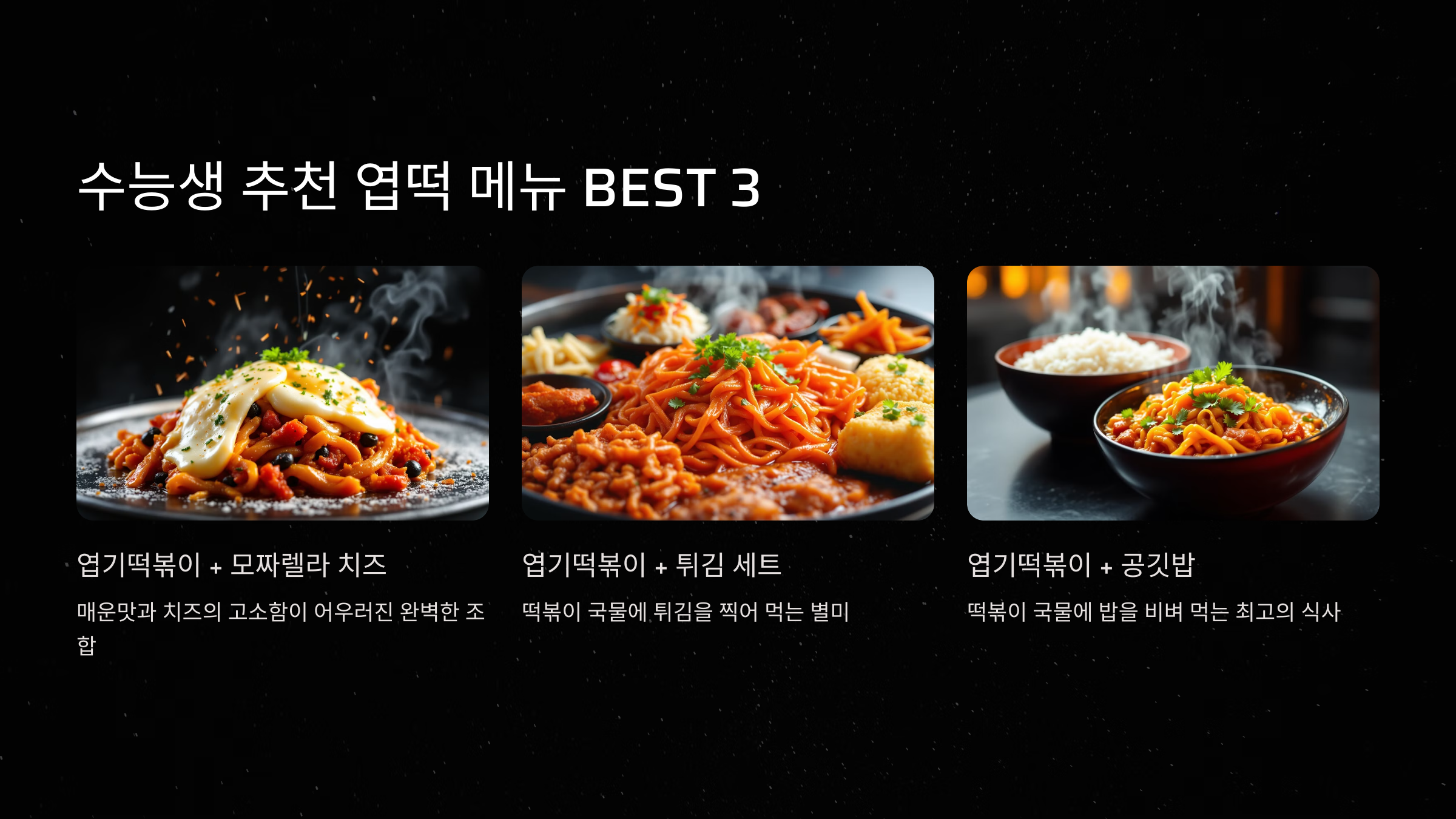 아래는 수험생들에게 인기 있는 엽떡 메뉴 BEST 3입니다.